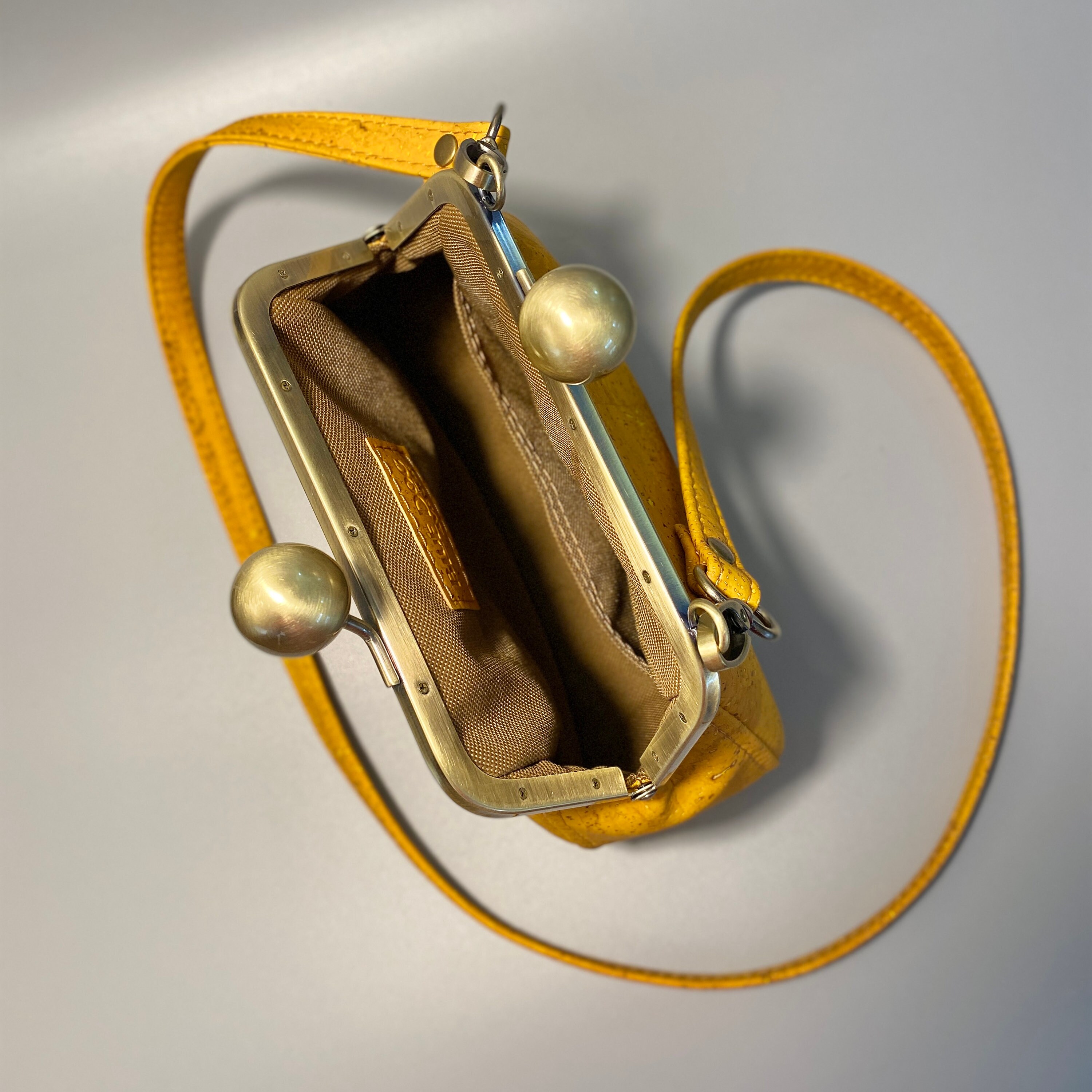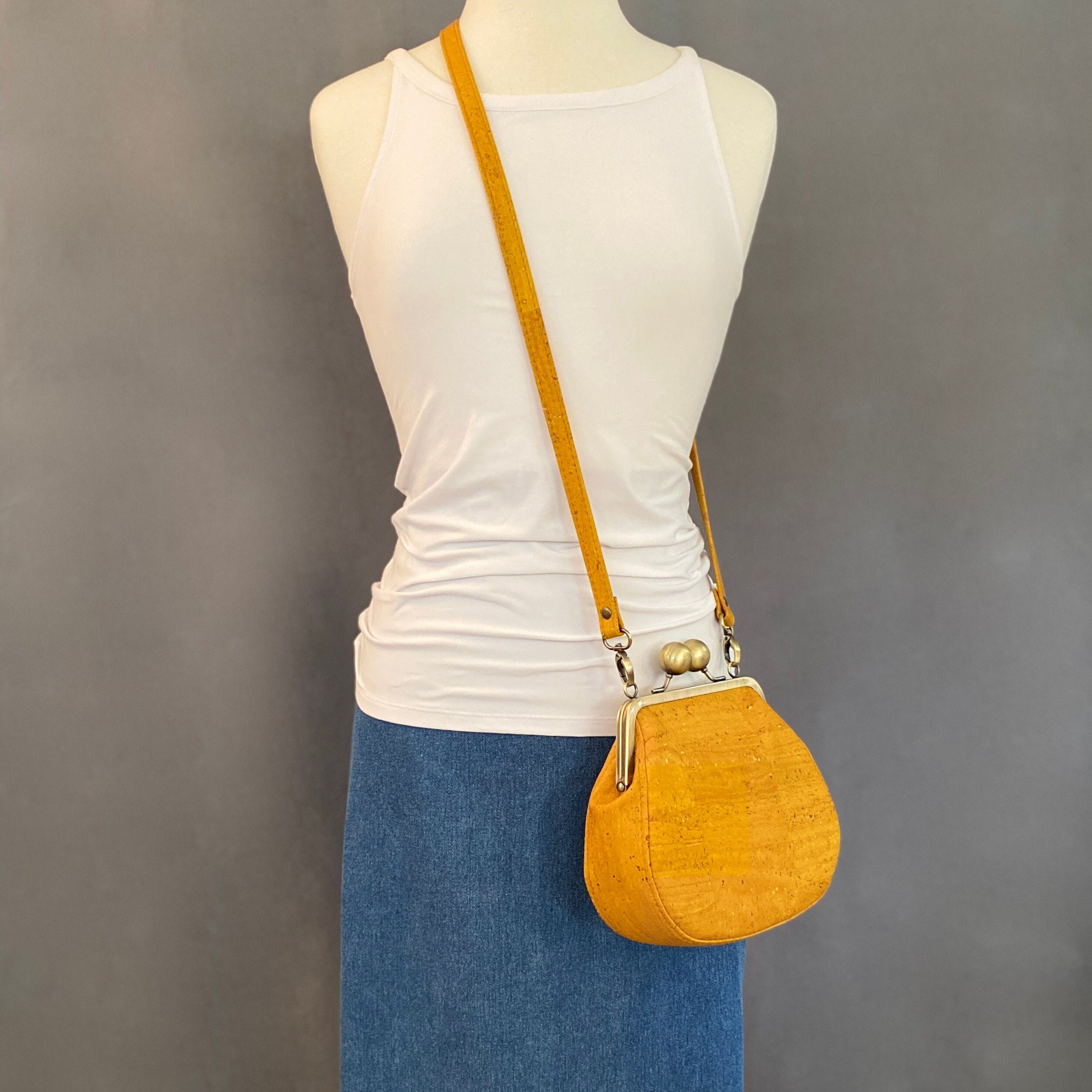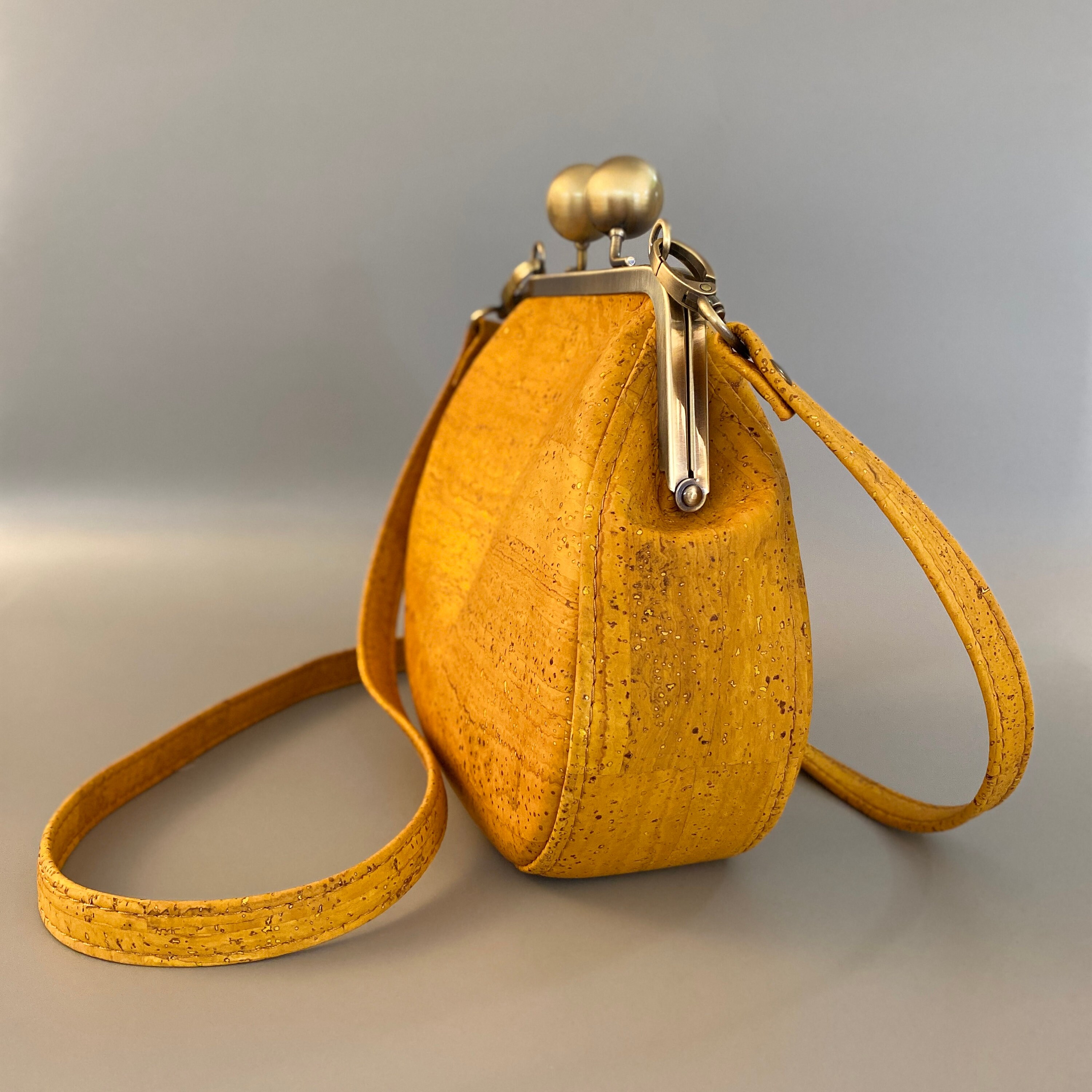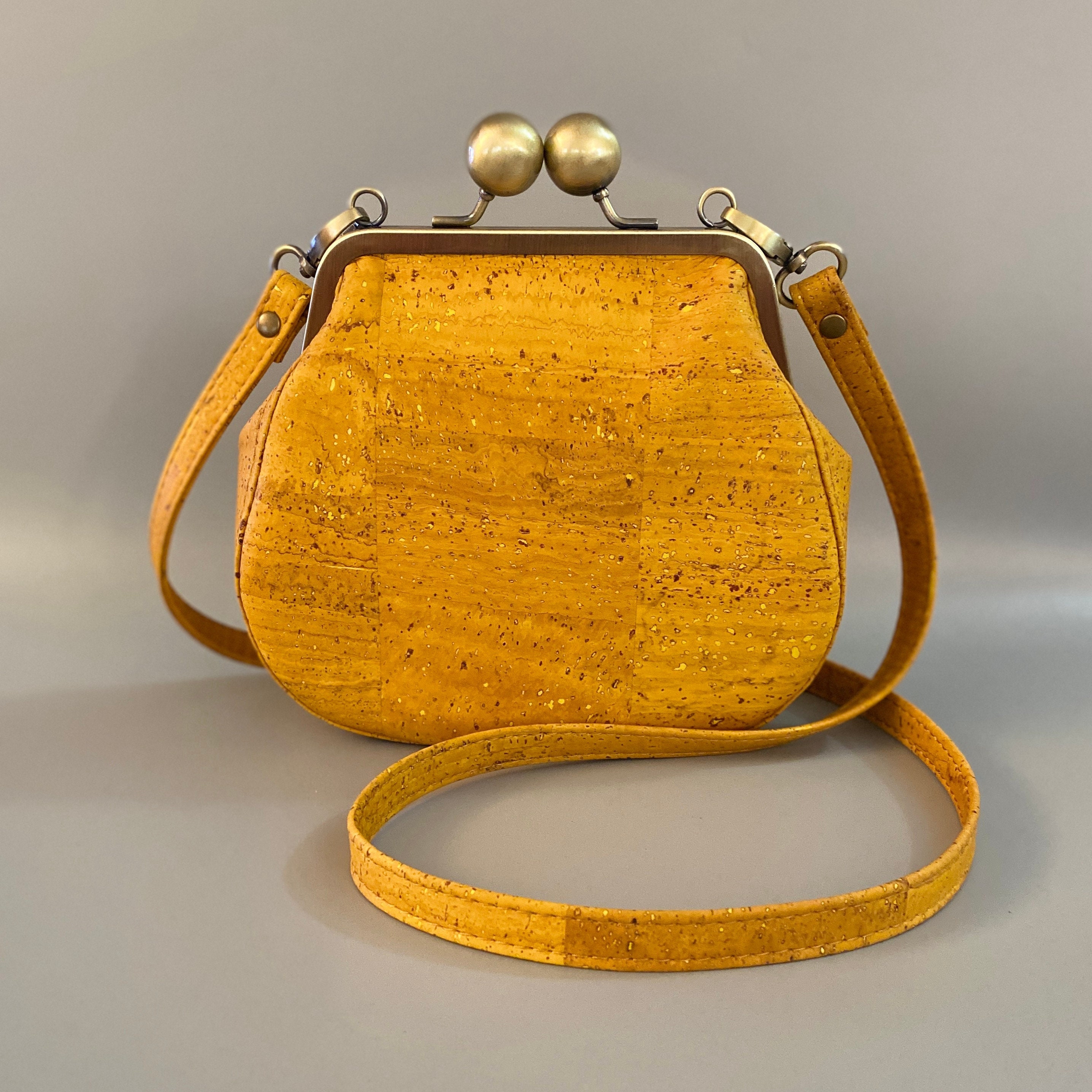 Ethel, a bespoke custom-designed kisslock saddlebag, is sure to add a delightful touch of vintage flair to any outfit. The uniquely beautiful look of the cork leather lends itself to the vintage vibe of this one-of-a-kind bag. Ethel boasts an oversized antique brushed bronze kisslock closure, topstitching details along the rounded gusset, an interior slip pocket and a crossbody strap. Each piece is carefully crafted by hand in my home studio, ensuring a unique and individual touch.