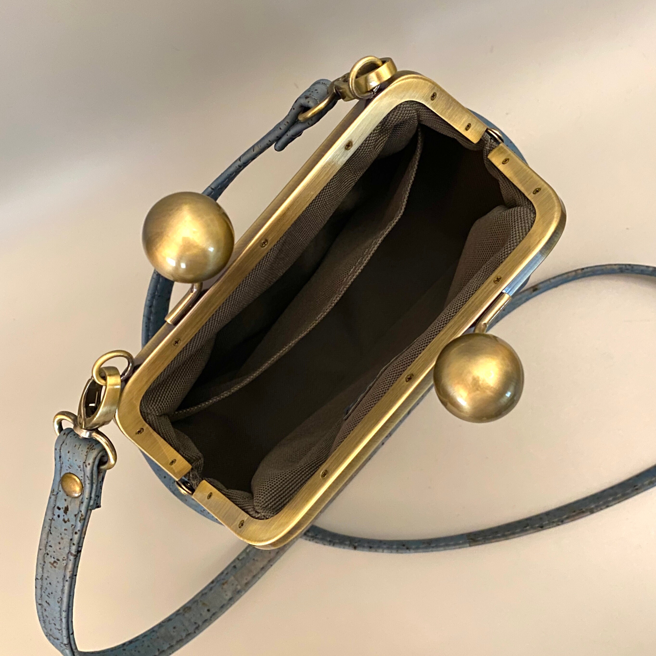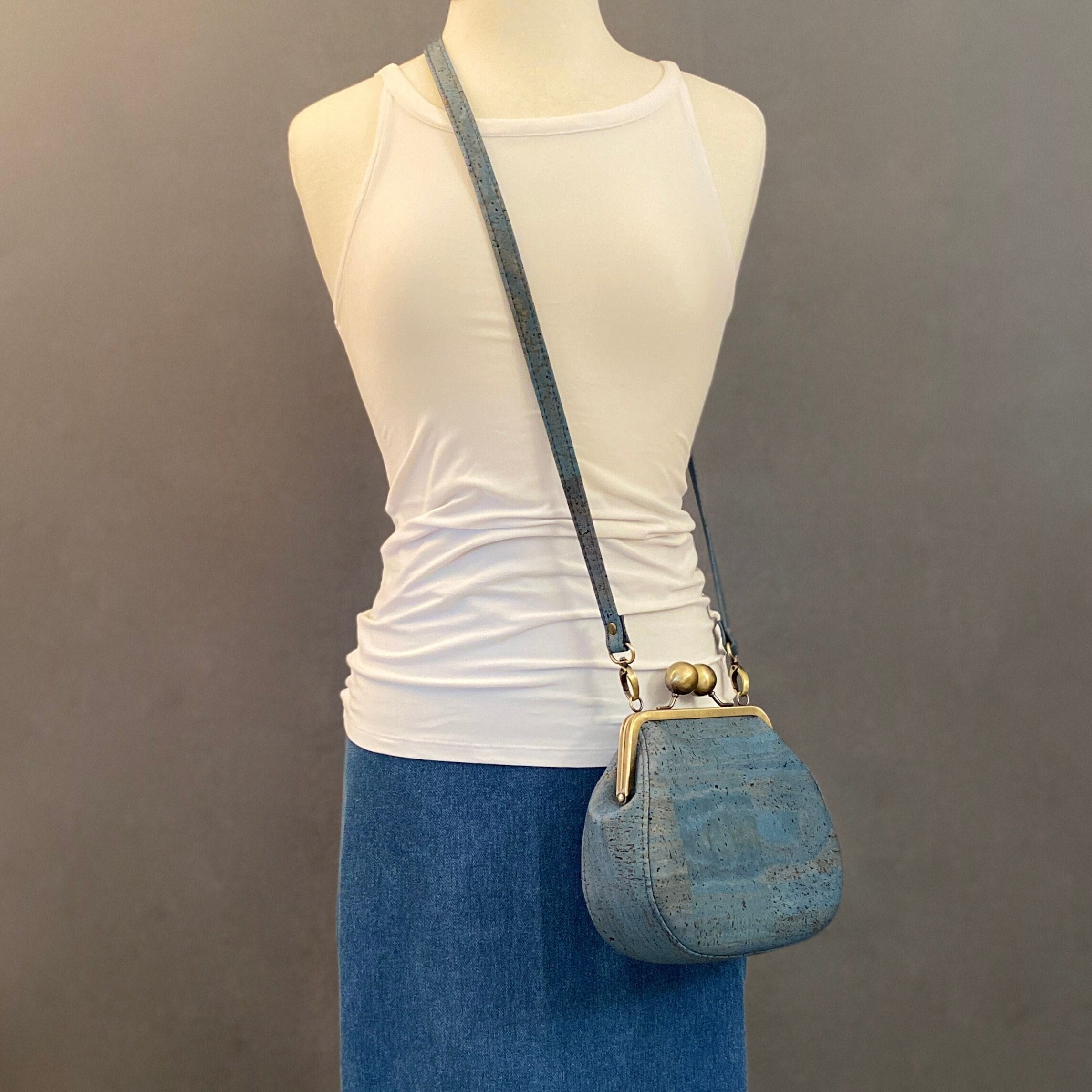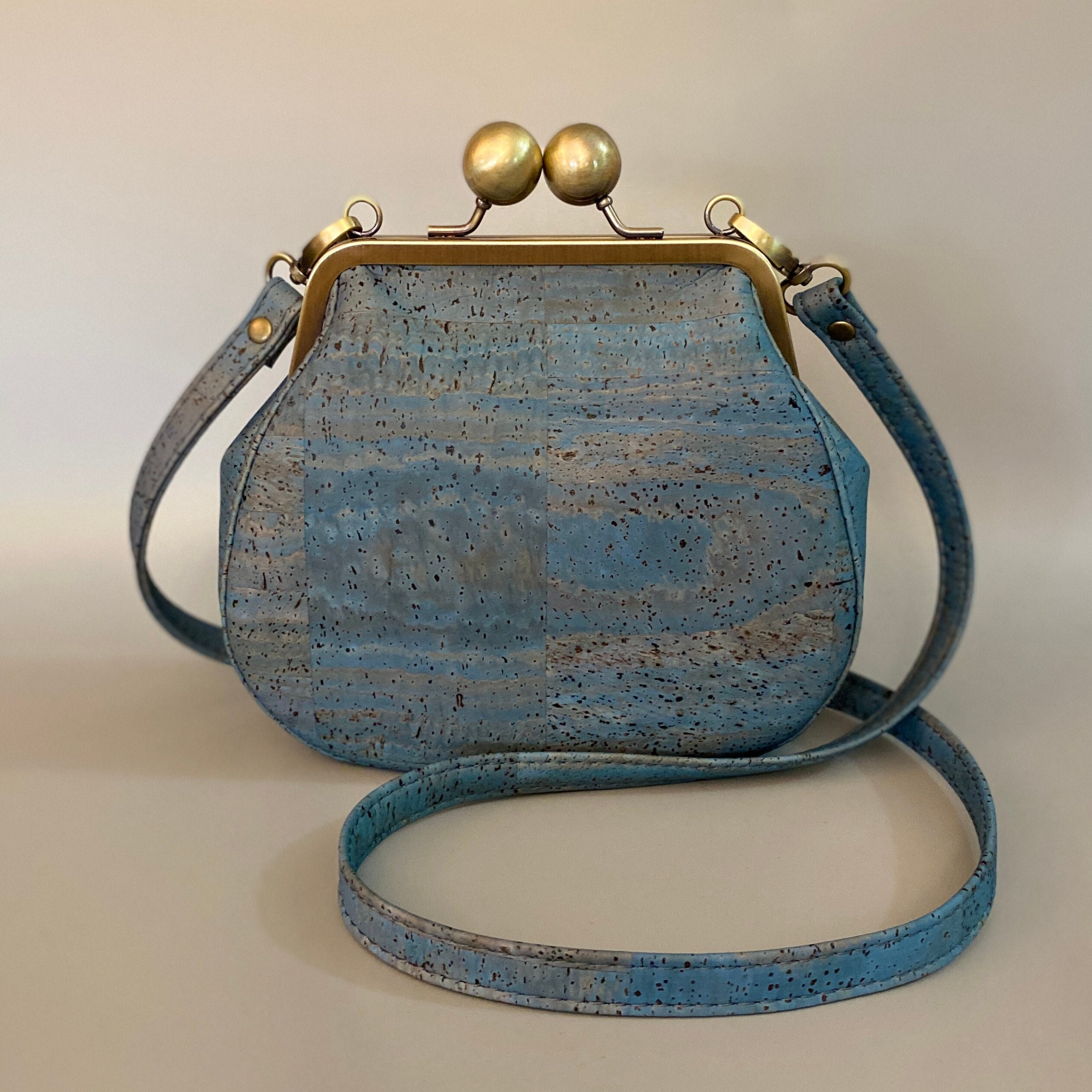 Ethel, a bespoke custom-designed kisslock saddlebag, is sure to add a delightful touch of vintage flair to any outfit. The uniquely beautiful look of the cork leather lends itself to the vintage vibe of this one-of-a-kind bag. Ethel boasts an oversized antique brushed bronze kisslock closure, topstitching details along the rounded gusset, an interior slip pocket and a crossbody strap. Each piece is carefully crafted by hand in my home studio, ensuring a unique and individual touch.