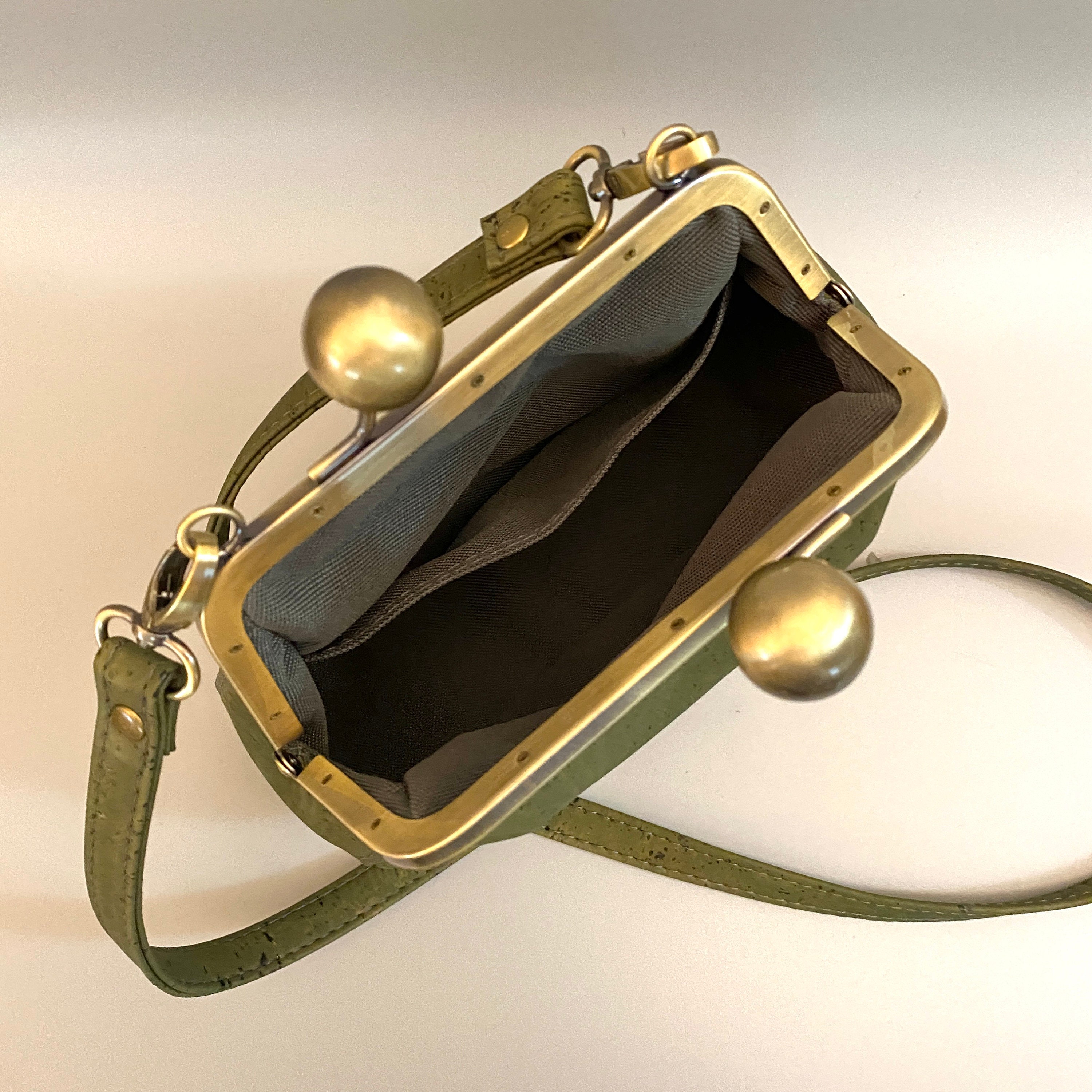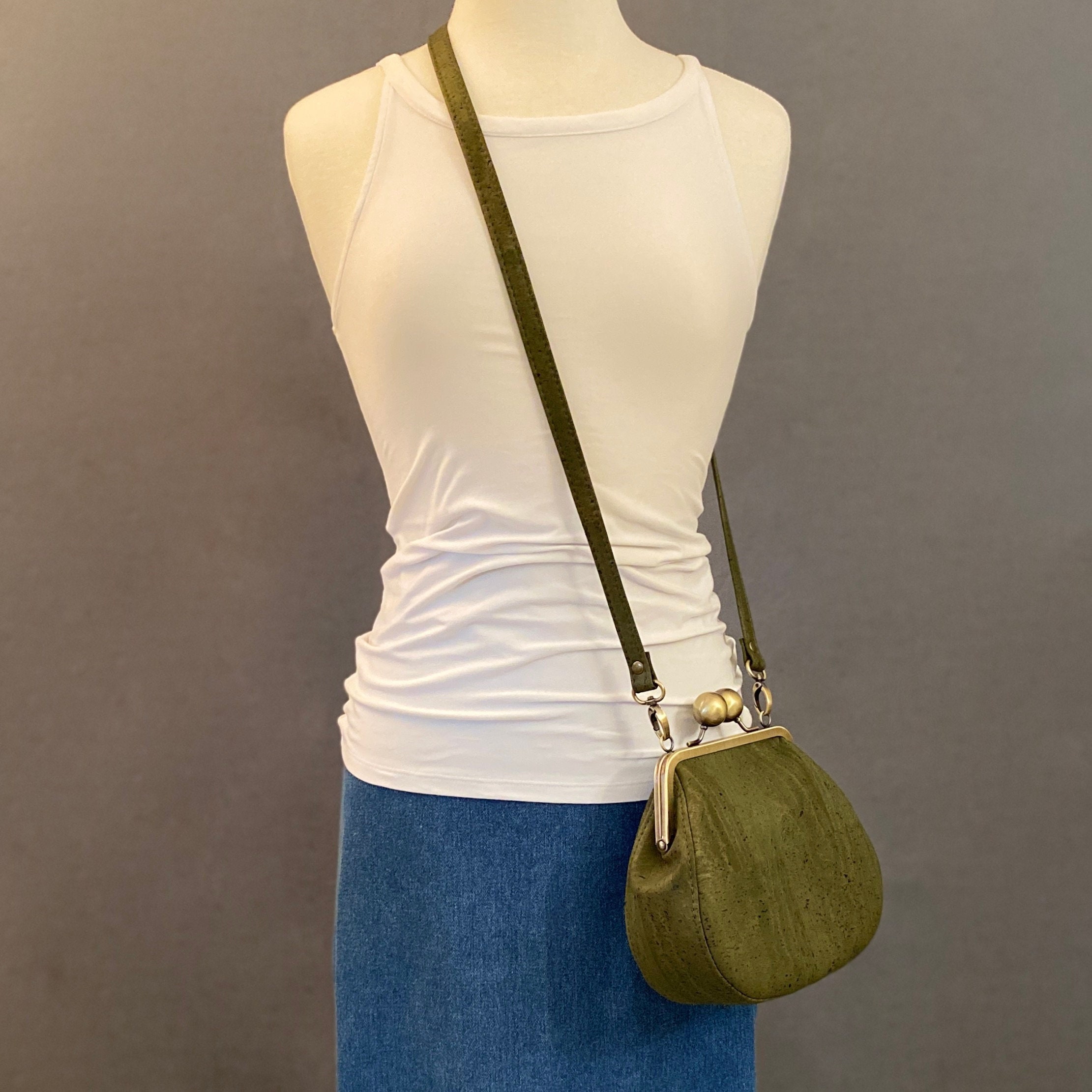 Ethel, a bespoke custom-designed kisslock saddlebag, is sure to add a delightful touch of vintage flair to any outfit. The uniquely beautiful look of the cork leather lends itself to the vintage vibe of this one-of-a-kind bag. Ethel boasts an oversized antique brushed bronze kisslock closure, topstitching details along the rounded gusset, an interior slip pocket and a crossbody strap. Each piece is carefully crafted by hand in my home studio, ensuring a unique and individual touch.